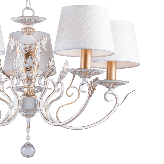Каркас светильника из металла белого цвета с золотой патиной, с акцентом золотых стаканов на цоколе. Абажуры слегка увеличенной формы из белой хлопковой ткани с крупным ажурным рисунком.