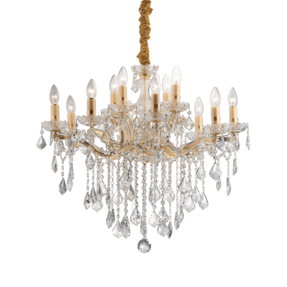Арматура из металла с декоративными стеклянными элементами. Подвески с восьмиугольными хрусталиками и капли из хрусталя с фацетом. Доступны в версии с прозрачным стеклом, в золотистом или хромовом - FLORIAN SP12 код 035604 - металлах.