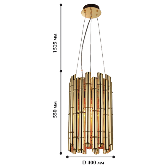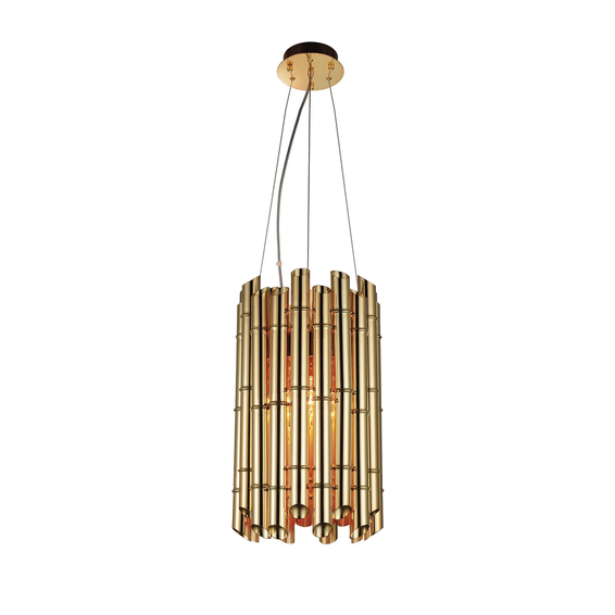 Светильник изготовлен из металла золотого цвета, элементы в виде трубок разного размера, спаянные между собой на разном уровне.