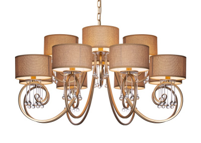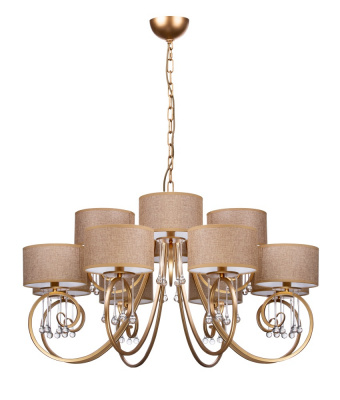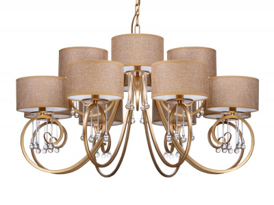 Каркас изготовлен из металла, окрашенного в цвет состаренное золото. Абажуры из светло-коричневого текстиля, стеклянные подвески прозрачные.