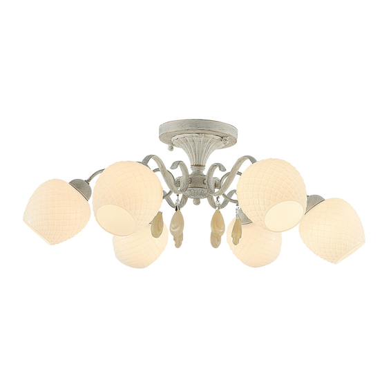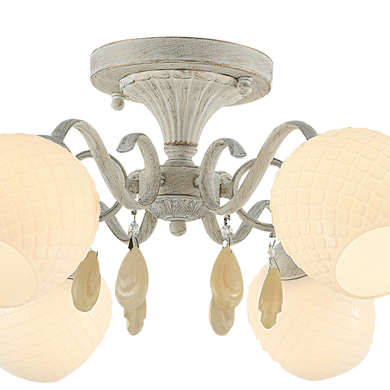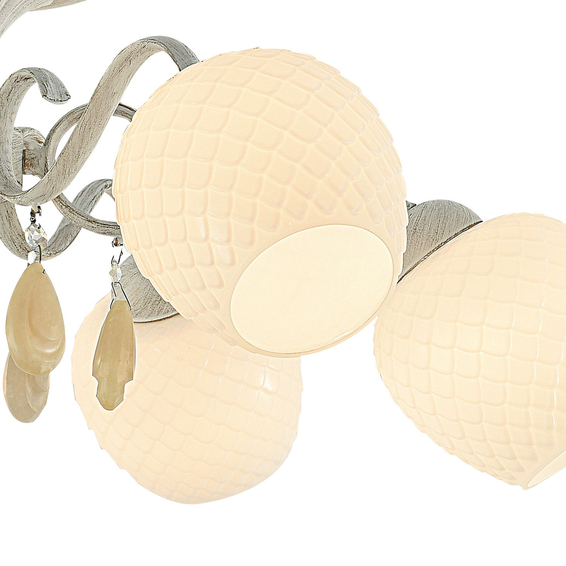 Каркас светильника из металла,окрашен в белый цвет с золотой патиной и оформлена выдувными плафонами,молочного цвета.