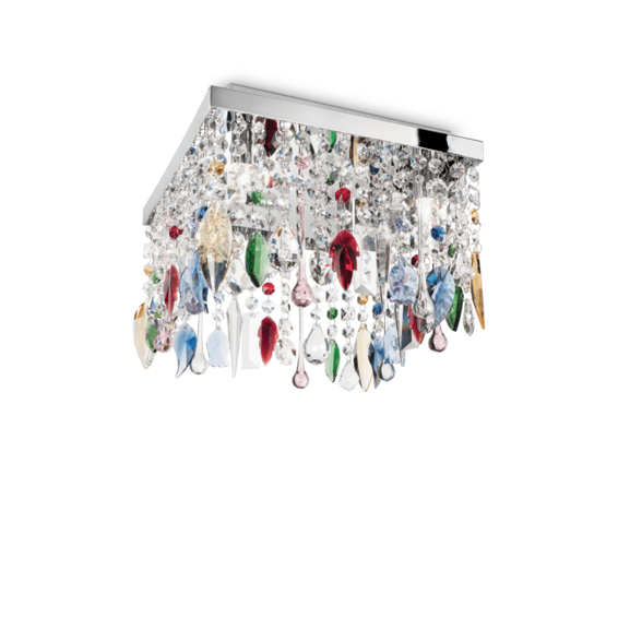 Арматура из хромированного металла. Подвески из восьмиугольного и пирамидного хрусталя разных цветов.