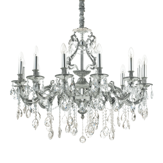 Корпус из литого металла цвета старинного серебра или золота. Восьмиугольные и круглые подвески из хрусталя с фацетом. Цепь скрыта бархатной тканью.