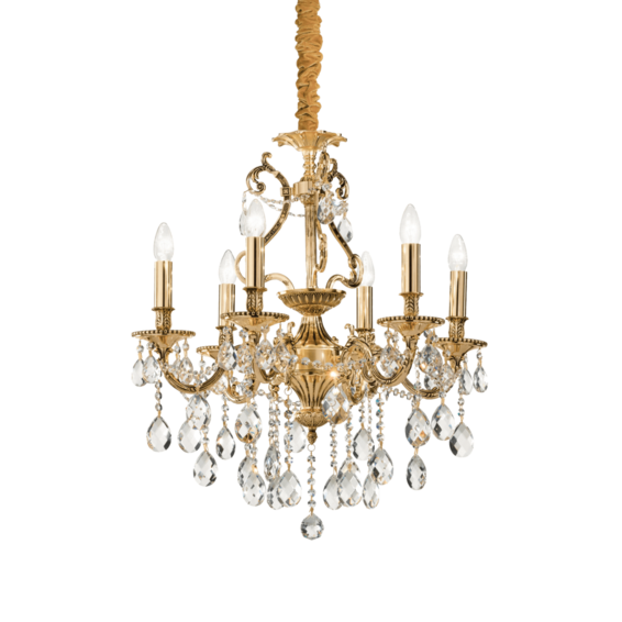 Корпус из литого металла цвета старинного серебра или золота. Восьмиугольные и круглые подвески из хрусталя с фацетом. Цепь скрыта бархатной тканью.