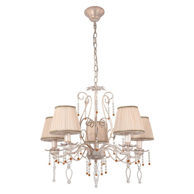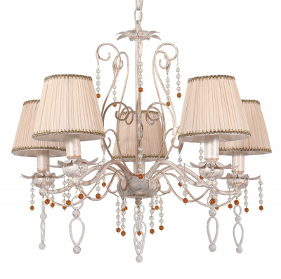 Каркас изготовлен из металла, окрашенного в белый цвет с золотой патиной, абажуры из бежевого текстиля, хрустальные подвески прозрачного и янтарного цвета.