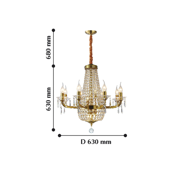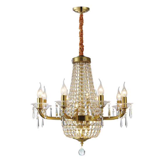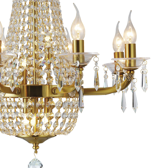 Каркас выполнен из металла цвета латуни, блюдца из прозрачного стекла, хрустальные подвески высшего качества, лампы G9 в комплекте.