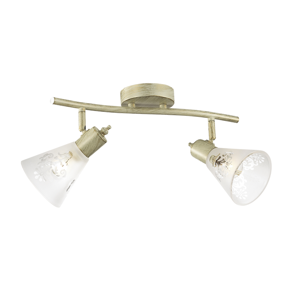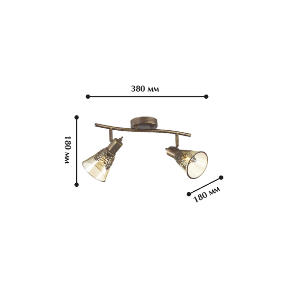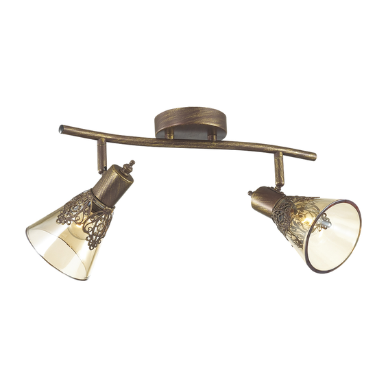 Каркас из металла коричневого цвета с золотой патиной, декоративный узор из металла на плафоне, плафон из прозрачного стекла коньячного оттенка. Доступен в цвете слоновой кости с золотой патиной и плафоном из матового стекла с прозрачным узором - GUMBATA 1794-2U.