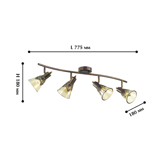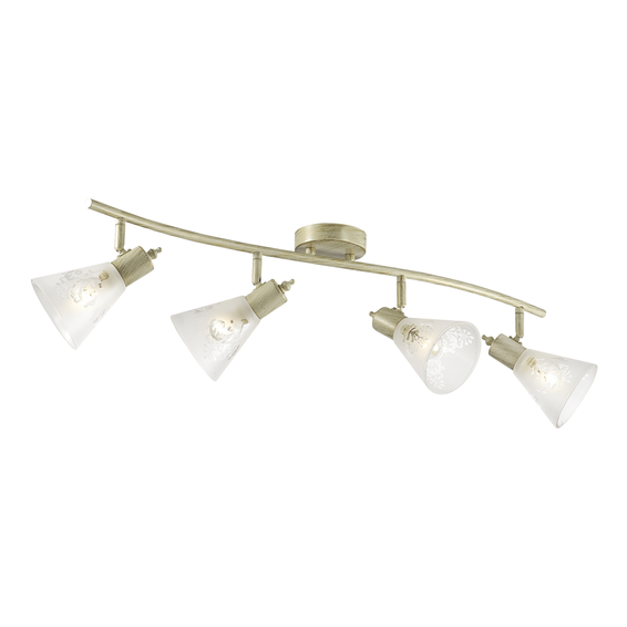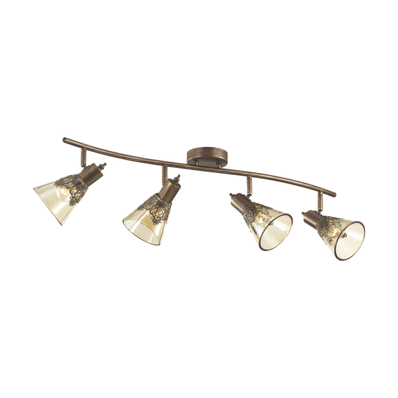 Каркас из металла коричневого цвета с золотой патиной, декоративный узор из металла на плафоне, плафон из прозрачного стекла коньячного оттенка. Доступен в цвете слоновой кости с золотой патиной и плафоном из матового стекла с прозрачным узором - GUMBATA 1794-4U.