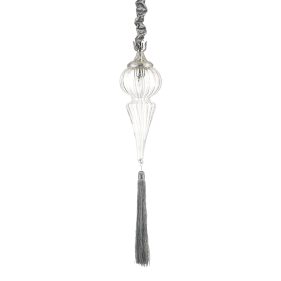 Арматура из металла серебра покрытия. Рассеиватель из прозрачного дутого стекла. Подвесы кисти. Цепь скрыта бархатной тканью.