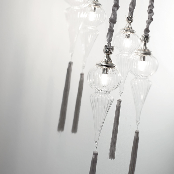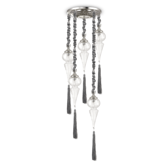 Арматура из металла серебра покрытия. Рассеиватель из прозрачного дутого стекла. Подвесы кисти. Цепь скрыта бархатной тканью.