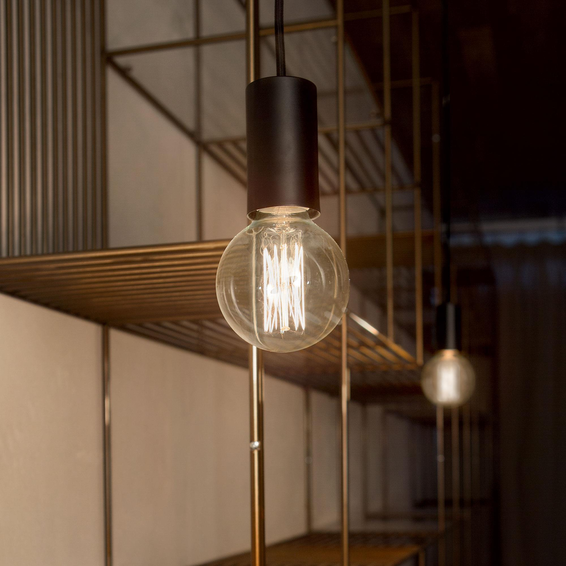 Потолочная чаша и корпус света из металла матовой белой или чёрной краски. Электрический провод покрыт тканью.