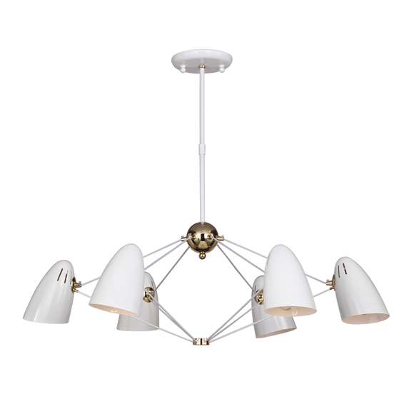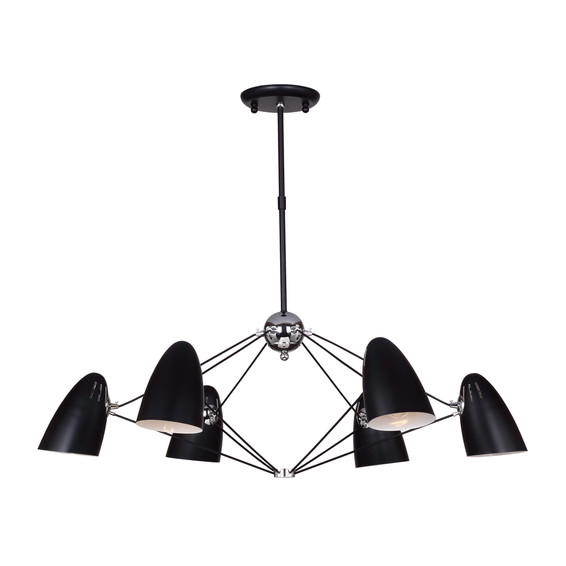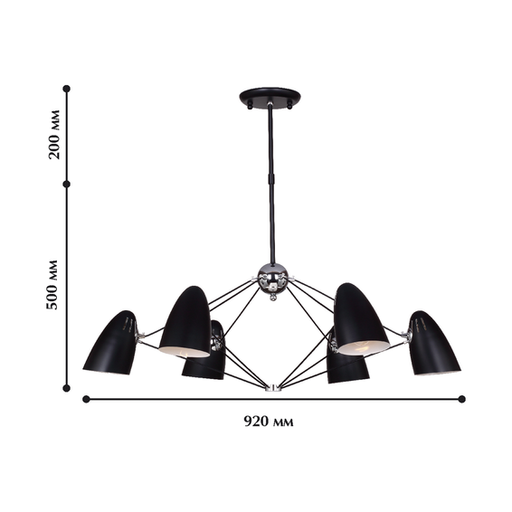 Металлический каркас светильника черного цвета, декоративные элементы хромированные. Центральная крепежная труба состоит из двух частей, можно менять высоту. Доступен в белом цвете, с золотыми элементами, код-1758-6P.