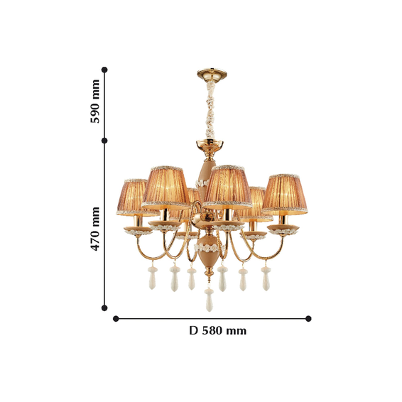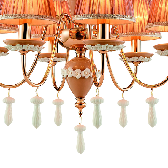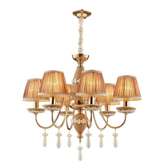 Каркас изготовлен из металла, покрытого золотом гальваническим способом, декоративные элементы из керамики бежевого цвета с белыми керамическими и подвесками, абажуры из розовой ткани.