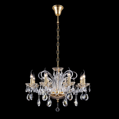 Арматура светильника сделана из металла,окрашена в золотой цвет.Корпус из прозрачного стекла.Подвески из хрусталя.