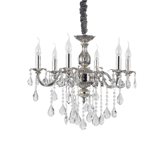 Корпус светильника из литого металла серебристого цвета под античный вид. Декоративные элементы из хрусталя с фацетом. Цепь скрыта бархатной тканью.