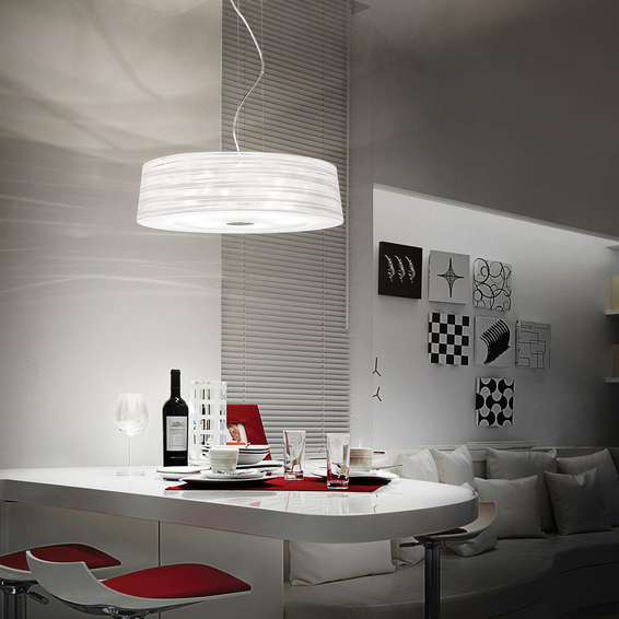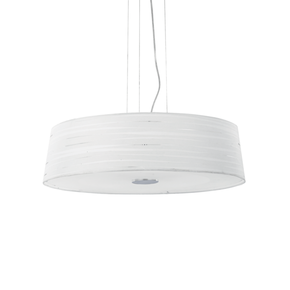 Арматура из хромированного металла. Абажуры из прозрачного материала ПВХ обтянуты лентами лёгкой тканью белой. Рассеиватель из прозрачного стекла пескоструйной обработки.