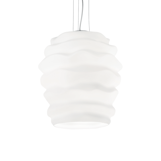 Арматура из хромированного металла. Рассеиватель из облицованного белого дутого и матового стекла. Стальные тросики регулируются по длине с помощью автоматического устройства.