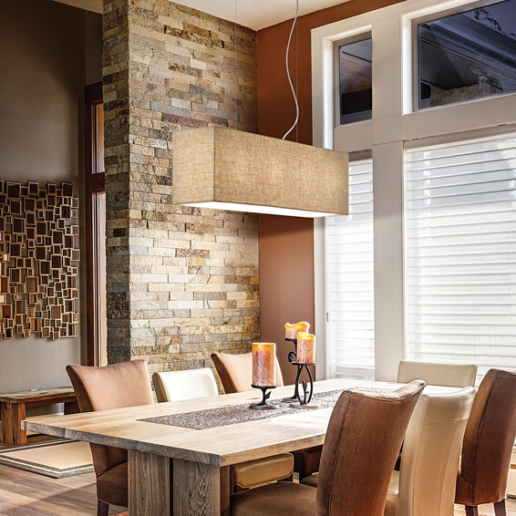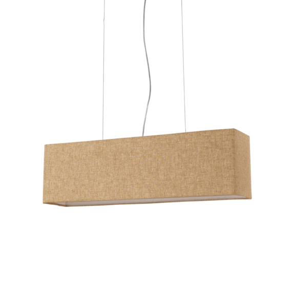 Арматура из хромированного металла. Абажур из материала ПВХ покрыт тканью канвы. Стальные тросики регулируются по длине.