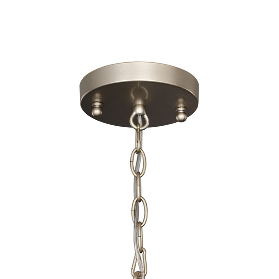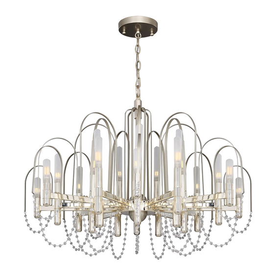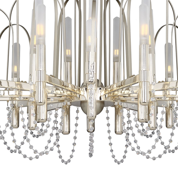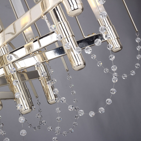 Арматура из металла цвета золотистого шампанского, декор из цепочек с хрустальными шариками, лампы G9 закрывают плафоны из матового стекла.
