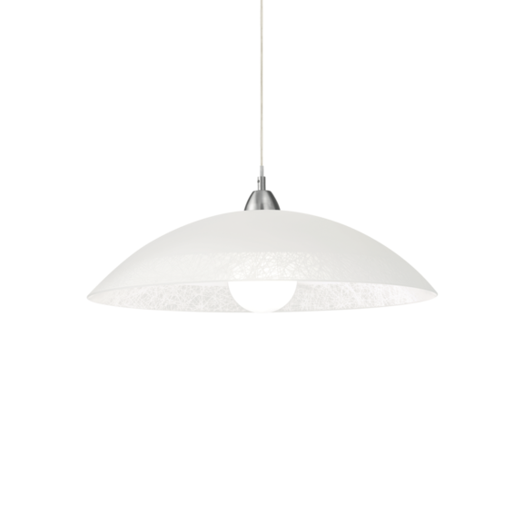 Рассеиватель из прозрачного стекла с декорациями трафаретной печати внутри и перскоструйной обработкой снаружи. Закрепляющие плафон крючки из хромированного металла.