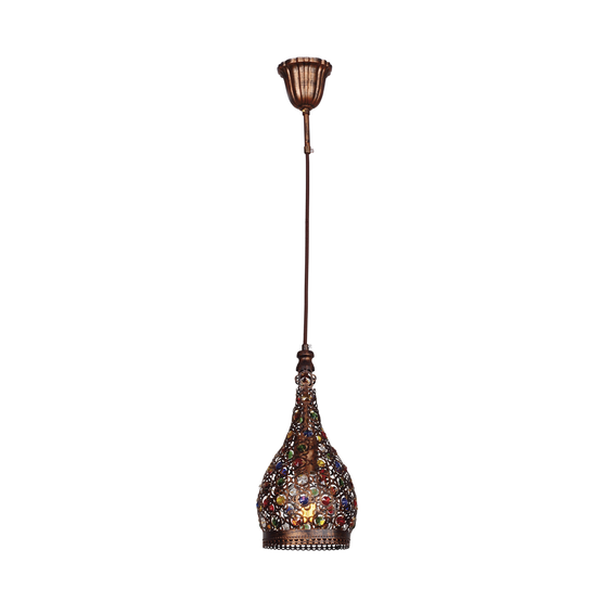 Арматура изготовлена из металла, окрашенного в цвет античной бронзы, под ажурную ковку. Вкрапления из хрустальных цветных элементов. Светильник имеет вытянутую форму плафона.