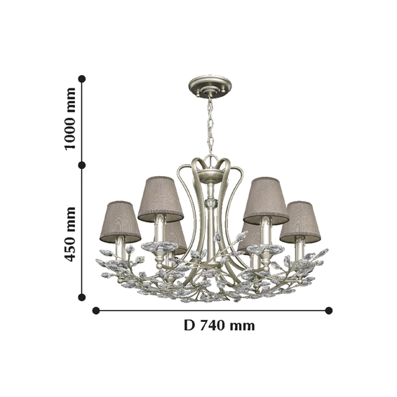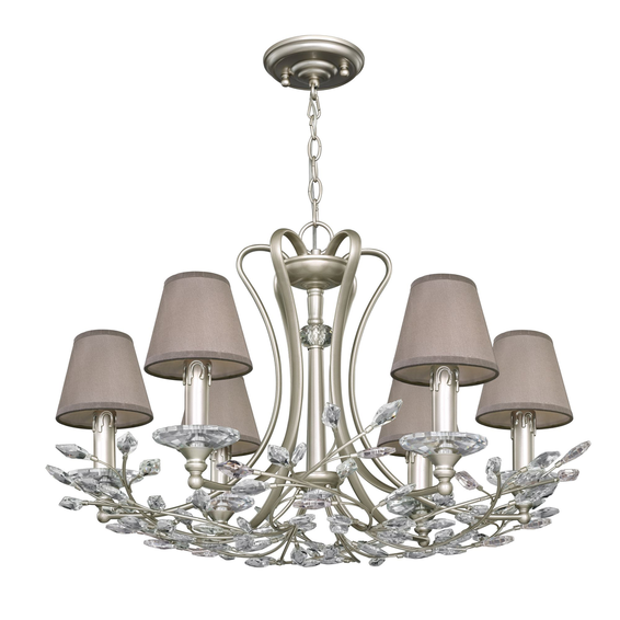 Арматура изготовлена из металла, окрашенного в светло-золотой цвет, абажуры из шелковой ткани тепло-серого цвета, хрустальные подвески высшего качества.