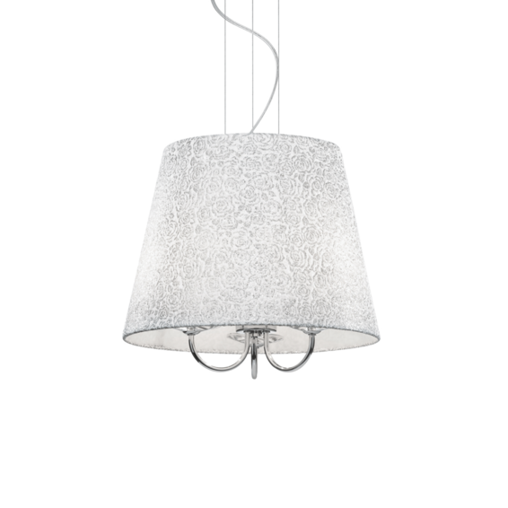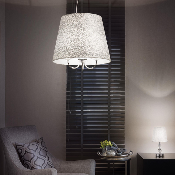 Арматура и основа из хромированного металла и стеклянных элементов фацетной огранки. Абажур из материала ПВХ покрыт тканью с вышитыми декорациями и блёстками.