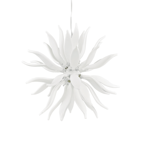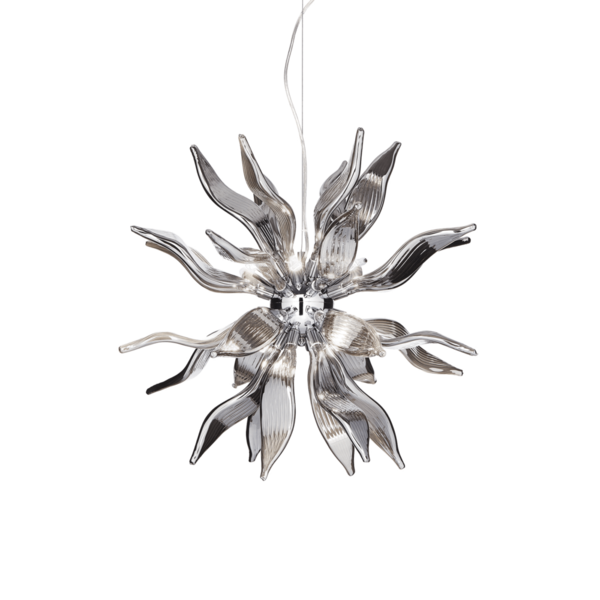 Арматура из металла. Декоративные элементы из дутого стекла ручной работы. Подвесы со стальными тросиками регулируемыми по длине. Доступна с белой арматурой и белыми стеклами.