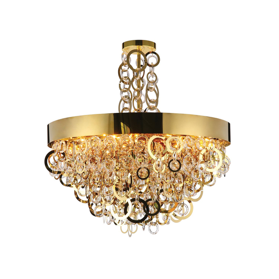 Каркас светильника из металла золотого цвета, декоративные подвески- стеклянные кольца разного диаметра.