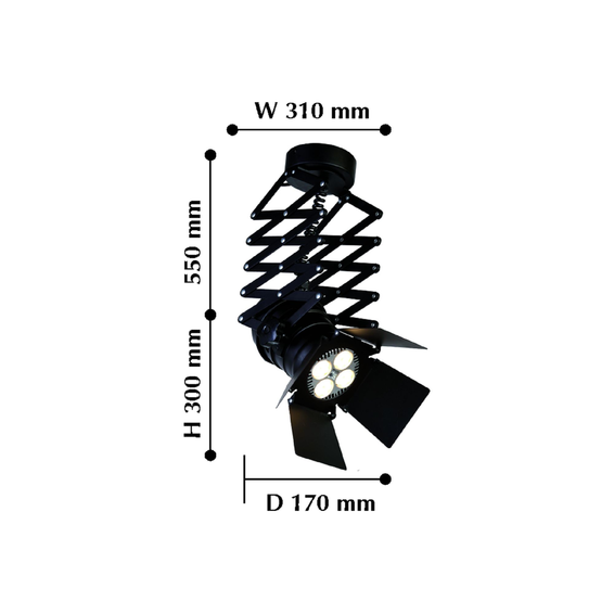 Черный цвет каркаса светильника, раздвижной механизм, можно использовать как на потолке, так и на стене.