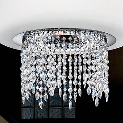 Рама и детали из хромированного металла.Молочно-белый рассеиватель из дутого стекла триплекс с кислотным травлением.Подвески хрустальные SWAROVSKI.