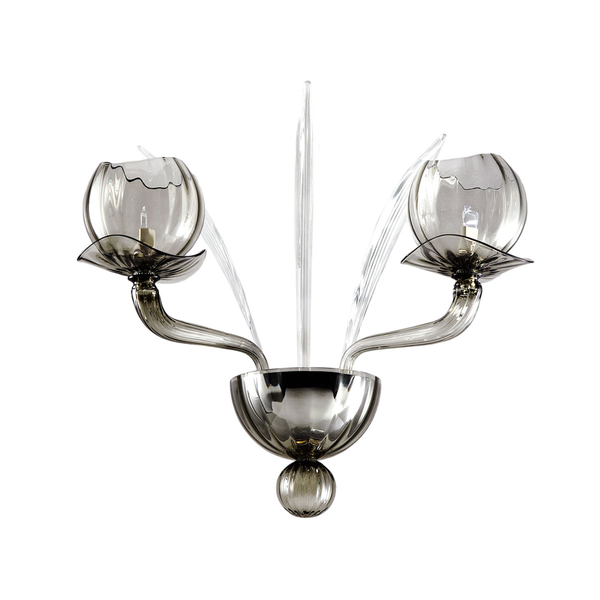 Каркас изготовлен из металла, плафоны и рожки из муранского стекла в разных цветовых решениях. Доступен в металле из светлого золота и хрома. Цвет муранского стекла - зеркальное золото в сочетании со стеклом соломенного цвета, табачный в сочетании со стеклом соломенного цвета, кристальный в сочетании с аметистовым стеклом, дымчатый и табачный.