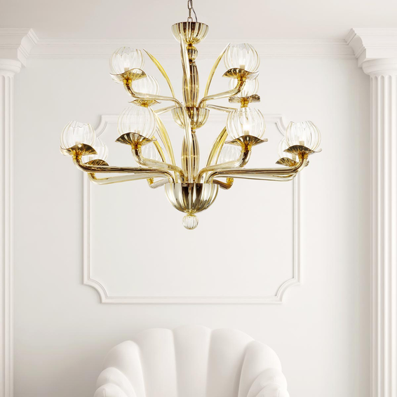 Каркас изготовлен из металла, плафоны и рожки из муранского стекла в разных цветовых решениях. Доступен в металле из светлого золота и хрома. Цвет муранского стекла - зеркальное золото в сочетании со стеклом соломенного цвета, табачный в сочетании со стеклом соломенного цвета, кристальный в сочетании с аметистовым стеклом, дымчатый и табачный.