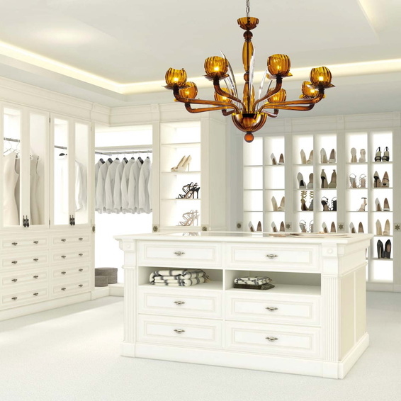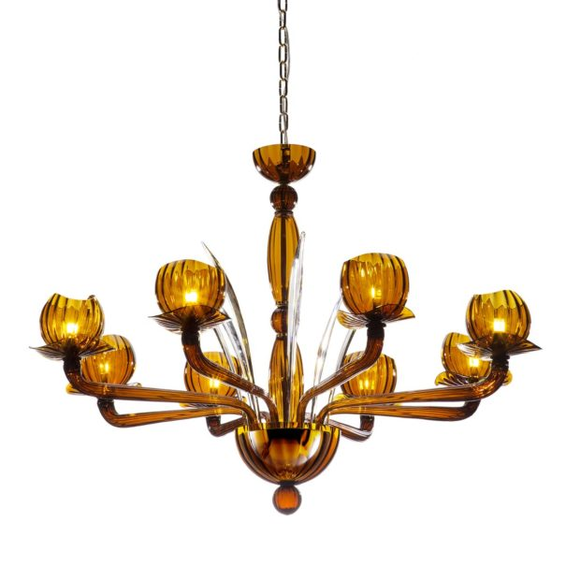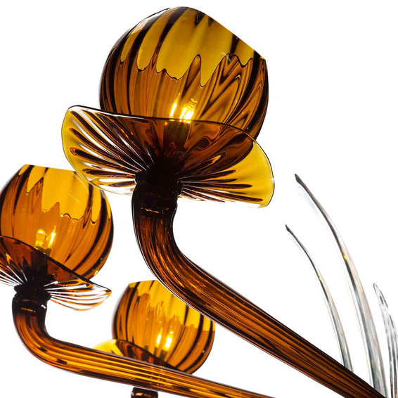 Каркас изготовлен из металла, плафоны и рожки из муранского стекла в разных цветовых решениях. Доступен в металле из светлого золота и хрома. Цвет муранского стекла - зеркальное золото в сочетании со стеклом соломенного цвета, табачный в сочетании со стеклом соломенного цвета, кристальный в сочетании с аметистовым стеклом, дымчатый и табачный.