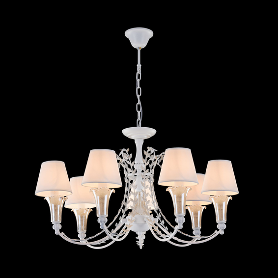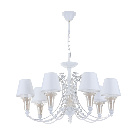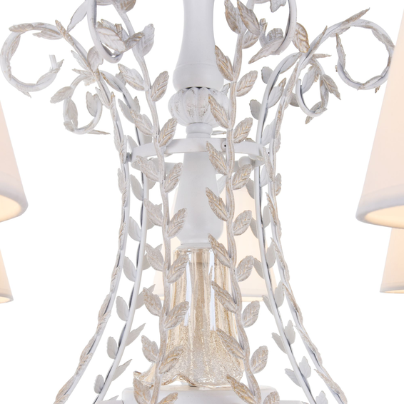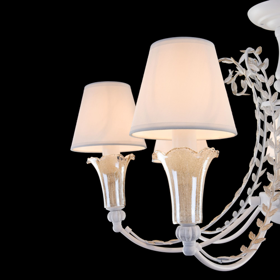 Изделия выполнены с флористическими элементами. Белоснежная арматура декорирована золотыми блестками, которые сочетаются с цветом кремовых абажуров.