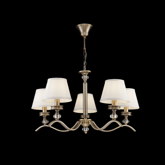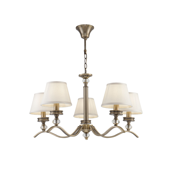 Металлическая арматура светильников Alessandra цвета бронзы сочетается с кремовым цветом абажуров из ткани. Абажуры окантованы лентой в тон. Дизайн арматуры дополнен декоративным элементом из стекла.