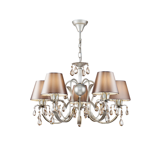 Арматура сделана из металла цвета античного серебра, коричневые абажуры - из атласа. Светильники украшены тонированными повесками.