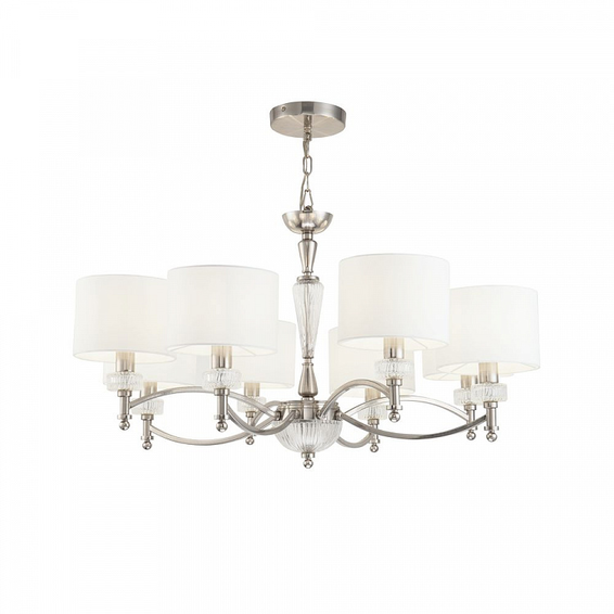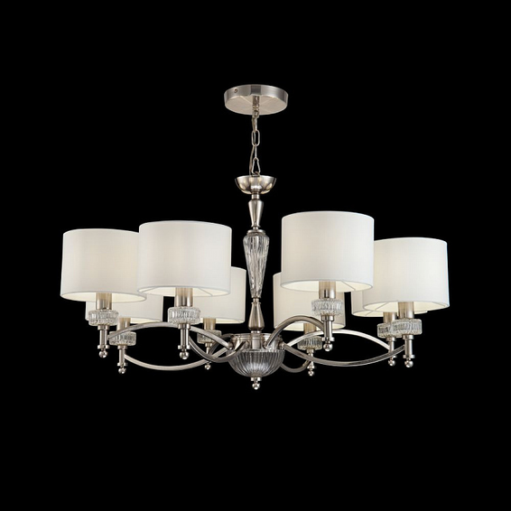 Арматура из металла. Стеклянный элемент в основании. Абажур из ПВХ покрыт белой тканью.