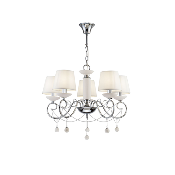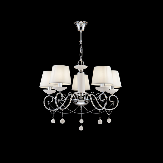 Изящная арматура из металла дополнена декоративными элементами и подвесками из белой керамики. Абажуры сделаны из белого текстиля.
