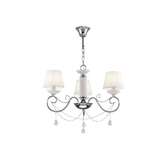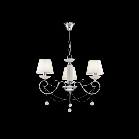 Изящная арматура из металла дополнена декоративными элементами и подвесками из белой керамики. Абажуры сделаны из белого текстиля.