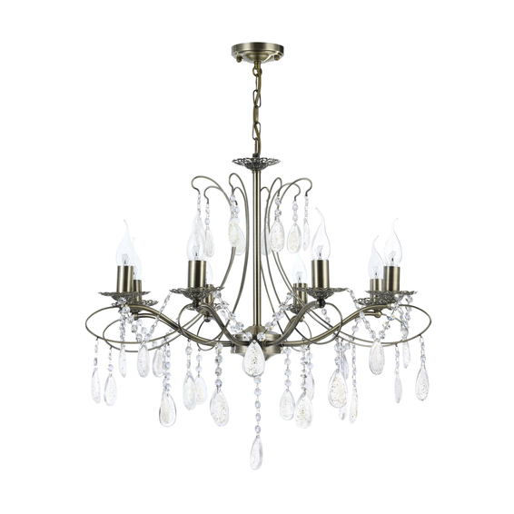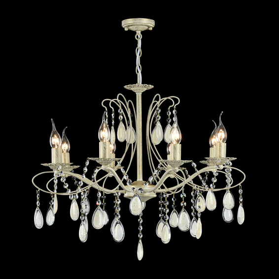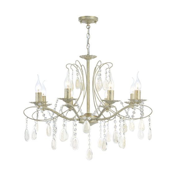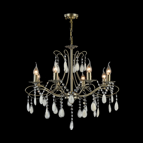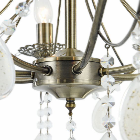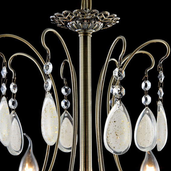 Хрустальные подвески сделаны в виде капель и украшены вкраплениями золотых блесток. Для светильников этой серии рекомендуем использовать лампочки «свеча на ветру».