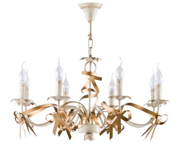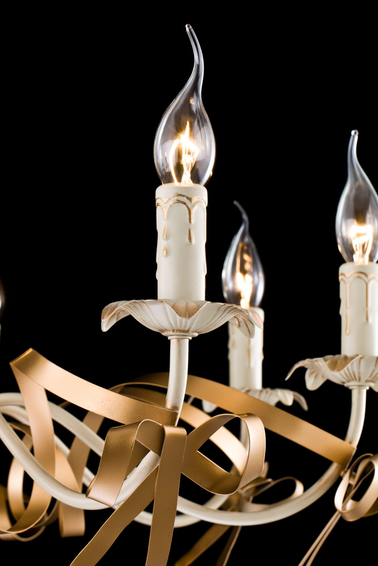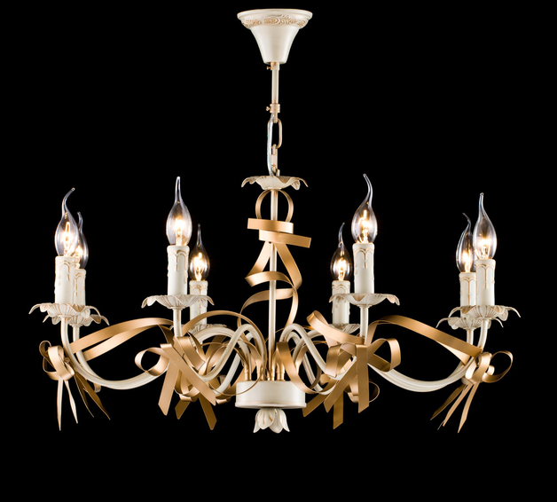 Благодаря ленте и бантам люстра выглядит празднично и торжественно, ее облик будет поднимать настроение владельцу не только в день его рождения, но и каждый день.