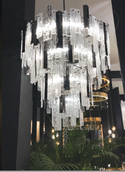 "Каркас на тросах из металла, прозрачное пулегозо и кованое муранское стекло в сочетании с лезвиями из светлого золота, черного никеля и металла. Доступен в металле: светлое золото, черный никель, чистая сталь. "
