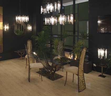 "Каркас на тросах из металла, прозрачное пулегозо и кованое муранское стекло в сочетании с лезвиями из светлого золота, черного никеля и металла. Доступен в металле: светлое золото, черный никель, чистая сталь. "