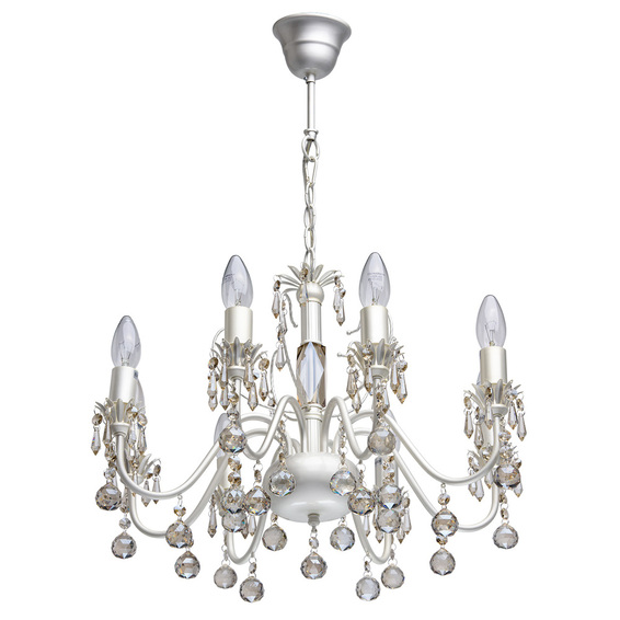 Металлическое основание окрашено в белый с мягким перламутровым блеском. Тонкие декоративные дуги подняты вверх и причудливо изогнуты, с них свисают тонкие хрустальные элементы. Круглые элементы гальванизированного хрусталя свисают с лепестков цветов, расположившихся под декоративными свечами. Роль свечей выполняют лампы на широких подставках. Нежность и роскошь классического стиля позволяют люстре идеально гармонировать также и с интерьерами стилей ампир или модерн. Диаметр люстры 56 см, высота 103 см, длина подвеса до 65 см, рекомендуемая площадь освещения 24 кв. м. Суммарная мощность 480 Ватт. Крашеное металлическое основание с перламутровым отблеском, декоративные элементы из гальванизированного хрусталя цвета шампань.