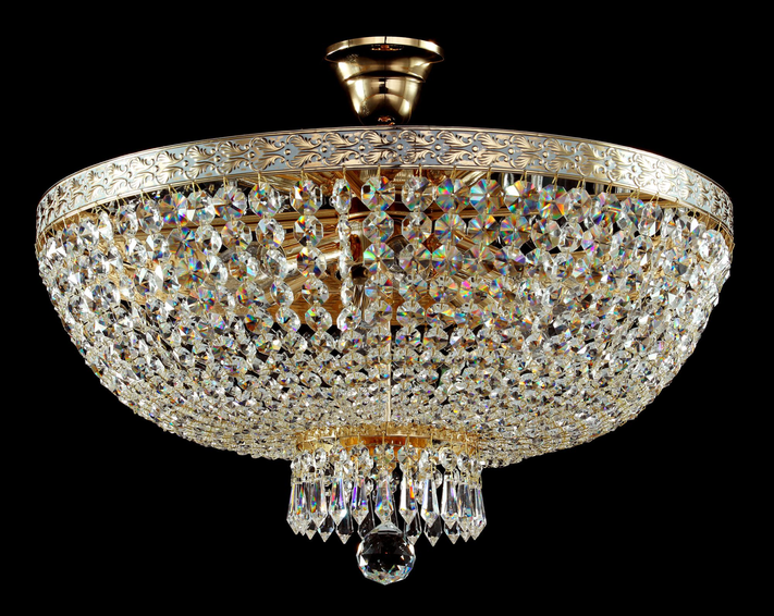 Каркас из металла. Патинированная лента из латуни с узором. Разнообразная огранка подвесок из *хрусталя.