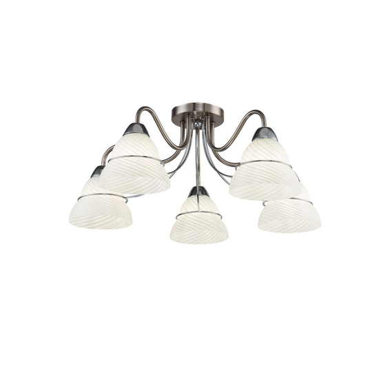 Арматура сделана из металла, а плафоны - из белого матового стекла со спиральным рельефом. Каждый плафон украшен металлической полоской в тон арматуры.