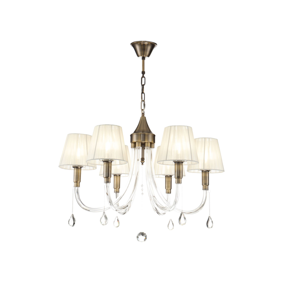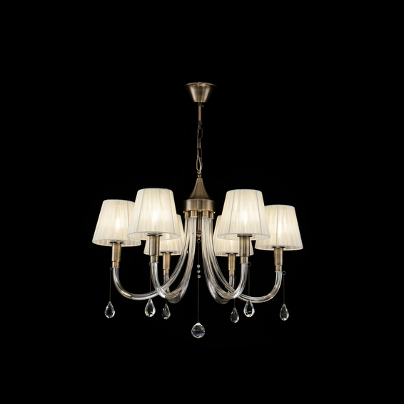 Металлическая арматура цвета бронзы оттеняет нежные абажуры из органзы цвета "шампань". Рожки сделаны из стекла и украшены подвесками.