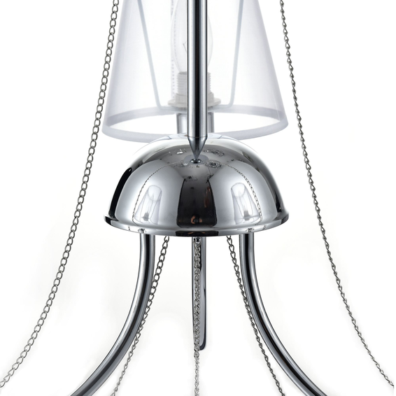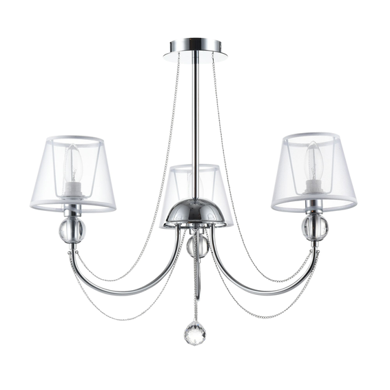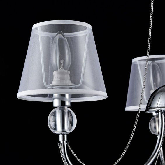 Арматура светильников - из металла, а абажуры – из прозрачной органзы и ПВХ. Каждый из светильников серии дополнен тонкими серебристыми цепочками, а основания рожков украшены стеклянными прозрачными шарами. Завершающий элемент дизайна светильников Beverly – это декоративные подвески.