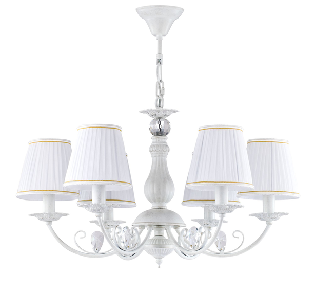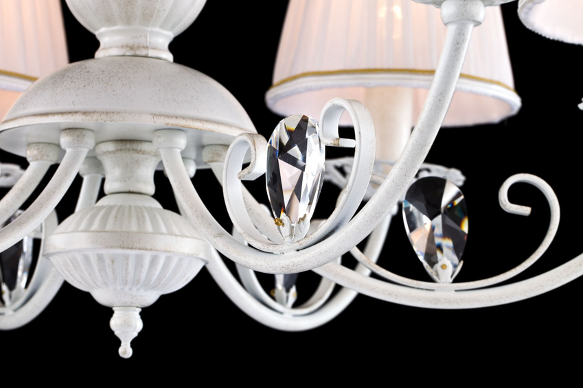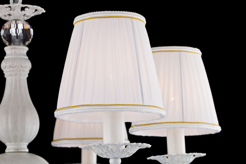 Арматура люстр украшена круглым декоративным элементом из стекла, а рожки декорированы кристаллами. Основание люстры и декоративная чаша крепления рожков дополнены орнаментом с золотым патинированием. Белоснежные абажуры украшены золотой тесьмой.